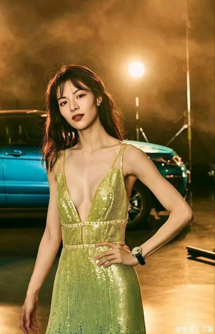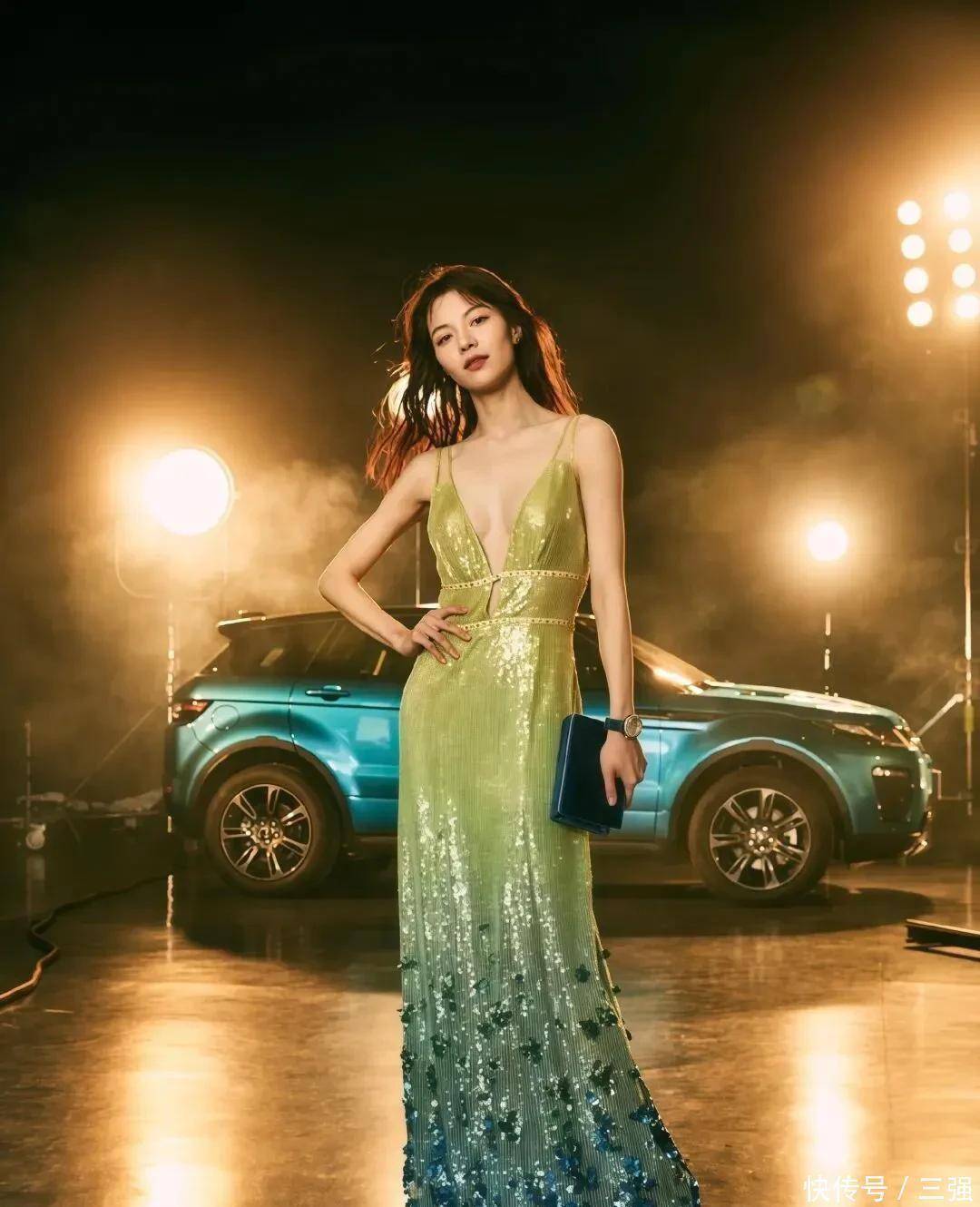 先看那套渐变亮片长裙,我的天!深V设计把锁骨线条露得刚刚好,收腰的地方一掐,腰臀比绝了!往那辆蓝色路虎旁边一站,又飒又媚,这姐们儿怎么能把亮片穿得这么高级?